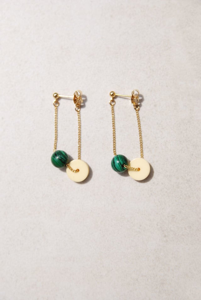 質感のあるグリーンとイエローのディスクの色合わせがモダンな印象に。耳の表と裏とチェーンでつなぐ形になるので、シンプルながら特徴的なピアスです。モダンなデザインなのでシンプルなお洋服にも合わせやすいです。