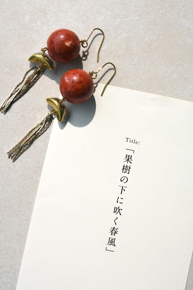 目を惹く惑星のような赤のウッドビーズが、光の残像を引き連れて浮遊しているようなイメージのピアス。存在感のあるボリュームながら、一つ一つのパーツが軽やかなため、つけ心地もライトです。モノトーンの装いやシックな装いにも合いそうです。