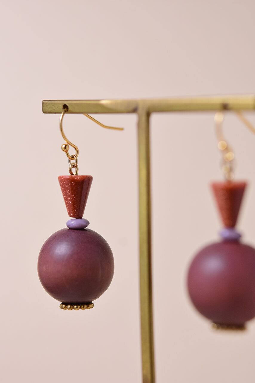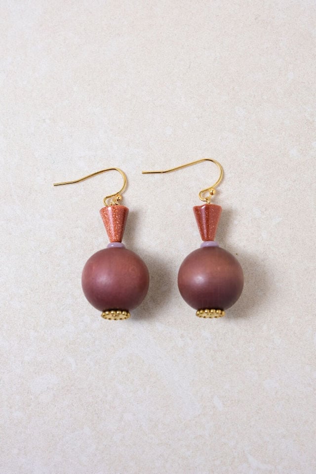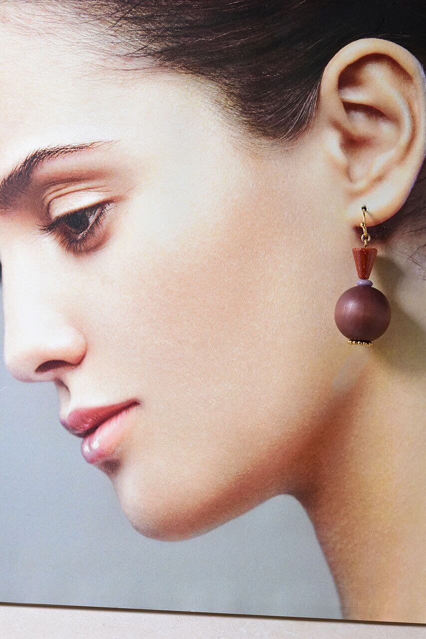木の実のような、少しマット目な質感のウッドパーツがかわいいピアスです。砂金石の明るいブラウンもなんだか楽しい気持ちになります。エンドに使用している真鍮パーツもシルエットがかわいらしいです。「ルン♪」と鼻歌を口ずさむ気分のイメージで制作しました。